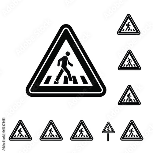Pedestrian crossing warning sign icon set. Vector illustration of road safety traffic symbols.