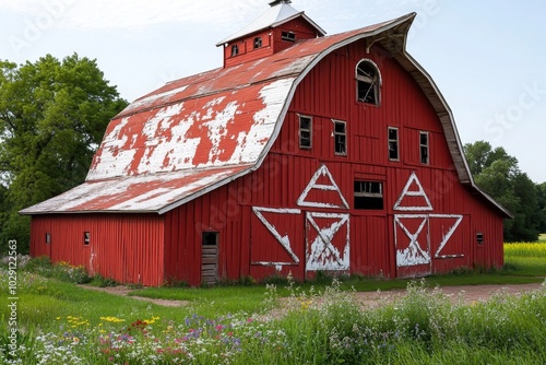 Peeling paint on an old barn, with the red paint faded and chipped, revealing the rough wood underneath, surrounded by overgrown grass and wildflowers, creating a nostalgic rural scene