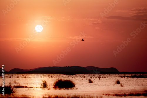 warm, sunset, sun, sky, pelican, outdoors, orange, nature, landscape, lake, evening, dusk, dawn, calm, bird