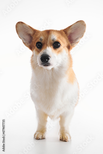 Pembroke Welsh Corgi portrait isolated on white studio background with copy space, purebred dog