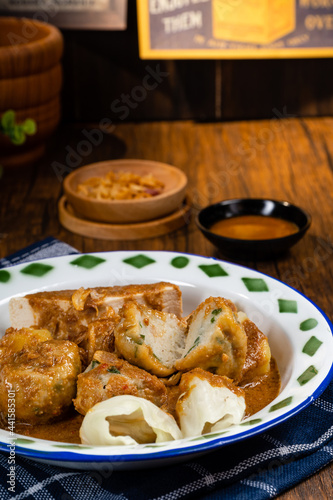 Pempek or empek-empek is a savoury Indonesian fishcake delicacy, made of fish and tapioca, from Palembang South Sumatera, Indonesia. Pempek is served with rich sweet and sour sauce called kuah cuko