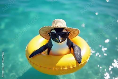 penguin, vacation, summer, rest, swimming, beach, hat, sunglasses, ocean, water, turquoise water, tropics, exotic, seascape, sunny, nature, resort, travel, holiday, vivid colors, calm, sea, summer heat, fun, summer getaway, family vacation, adventure, beach vacation, relaxation, humor, positive, animal, tropical, leisure, pool, swim, blue, holiday