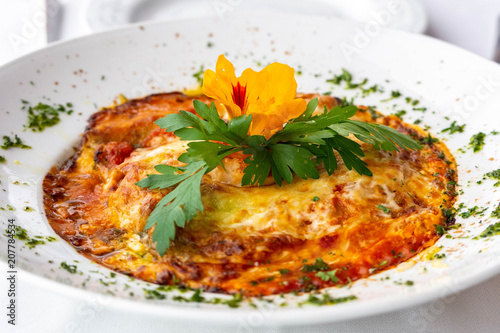 penne pasta with seafood in close up decorated with a branch of parsley and a yellow flower
