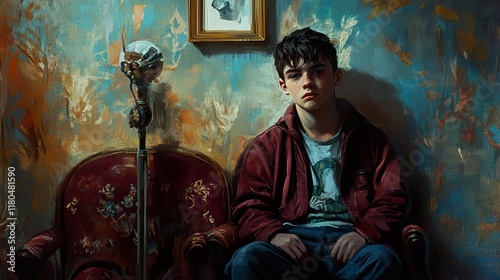 boy, portrait, young, teenage, male, sitting, chair, room, wall, vintage, retro, old, worn, expression, serious, pensive, thoughtful, introspective, melancholy, lonely, sad, depressed, dark, shadow, light, contrast, texture, paint, artistic, style, painting, art, artwork, image, picture, photo, visual, graphic, design, composition, colours, palette, mood, atmosphere, feeling, emotion, human, figure