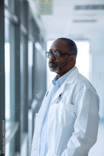 doctor, health care, medicals, physician, hospital, clinic, medicine, wellness, professional, labcoat, stethoscope, corridor, hallway, thoughtful, pensive, contemplative, window, light, health, care, treatment, diagnosis, research, expertise, seriousness, dedication, commitment, uniform, goggles, african, american, male, man, adult, beard, standing, modern, indoor, clinical, facility, looking, side, confident, trust, leader, science, innovation, technology, specialist