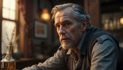 man, elderly, portrait, pub, rustic, dramatic, lighting, contemplative, pensive, weathered, face, warm, dimly, lit, mood, atmosphere, vintage, retro, photo, photo, image, picture, art, artistic, style, commercial, advertising, marketing, model, senior, grey, hair, beard, eye, expression, texture, shadow, background, detail, sharpened, composition