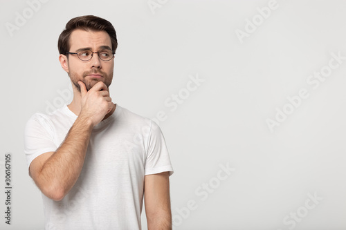 Pensive man in glasses look at blank copy space thinking