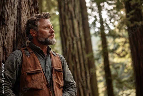 Pensive man with vest leans against redwood tree, gazing into the light-dappled forest, contemplating nature.