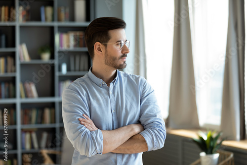 Pensive millennial Caucasian man in glasses look in window distance thinking or pondering of problem solution. Thoughtful young male lost in thoughts, decide or plan. Business vision concept.