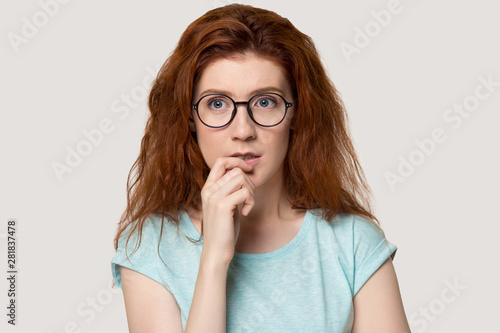 afraid, canvasses, anxiety, attractive, background, challenge, choice, concept, confused, decide, decision, dismay, doubt, doubtful, embarrassed, eyewear, experiencing, girl, goggles, grey, head shot, hesitant, indecision, isolated, making, mind, nervous, pensive, person, portrait, problem, question, redhead, reflective, risk, search, serious, solution, stress, studio, thinker, thinking, thoughtful, thought, trouble, uncertain, uncertain, woman, worry, young