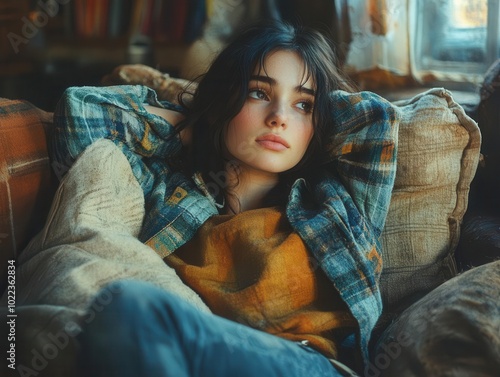 missy, solitude, pensive, cushion, couch, introspection, emotional, loneliness, contemplative, home, vulnerability, warmth, interior, melancholy, introspective, peaceful, quiet