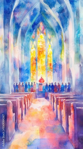 church, pentecost, celebration, prayer, oneness, light, watercolor, spirituality, community, worship, faith, inspiration, sacred, colours, joy, hope, reverence, harmony, blessing, love, tradition, gathering, people, religious, serenity, devotion, ambience, grace, peace, fellowship, ritual, symbol, illumination, culture, warmth, togetherness, artistry, sanctuary, message, belief, calmness, diversity, spirit, beauty, connection, homage