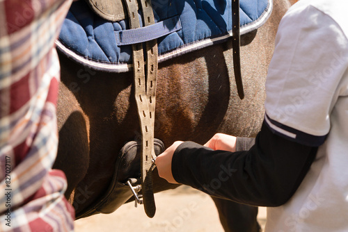 saddle, horse, strap, adjusting, hand, teamwork, equestrian, equine, closeup, equestrianism, tack, horseriding, detail, collaboration, buckle, farm, stable, horsemanship, leather, care, grooming, preparation, safety, animal husbandry, secure, animal, woman, rider, bridle, equipment, sport, people