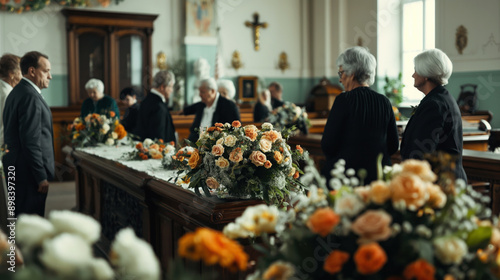 People attending a funeral in a church, standing around a casket with floral arrangements. The atmosphere is solemn, with individuals dressed in dark clothing.