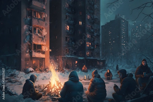 People camping fire near ruins and destroyed apartment in winter, Generative AI