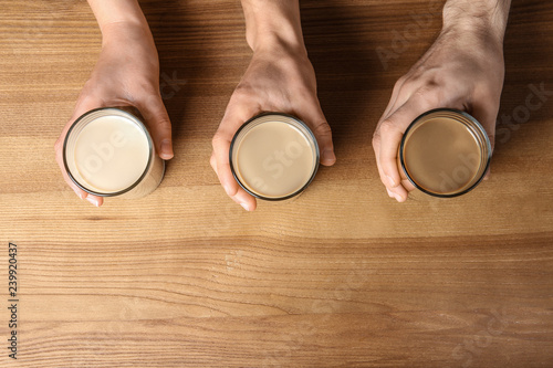 People holding glasses with protein shakes on wooden background, top view. Space for text