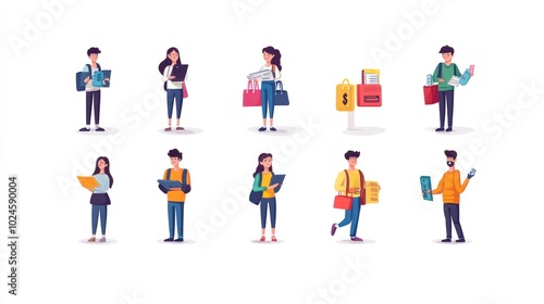 people, holding, item, person, man, woman, illustration, character, pose, design, graphic, art, flat, style, cartoon, cute, fun, happy, casual attire, standing, walking, hand, bag, book, folder, phone, tablet, laptop, money, bill, paper, shopping, mailbox, post, mail, envelope, document, reading, communication, lifestyle, city, urban, modern, technology, work, job, business, professional, student