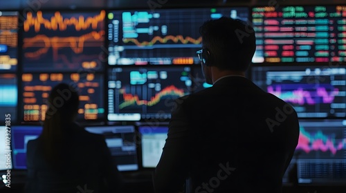 People intensely observing stock market data in a trading room with bright screens