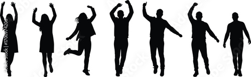People jumping, celebrating, happiness, joy, excitement, silhouette, dance, success, group, energetic, fun, movement, cheer, freedom, party,