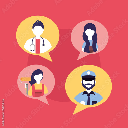 bubble, people, profession, talking, vector, illustration, labor, men at work, industry, character, professional, day, work, engineer, american, business, employment, job, occupation, international, background, celebration, happy, design, flag, doctor, may, uniform, different, technician, symbol, cartoon, diversity, working man, service, team