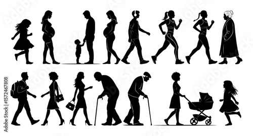 people, silhouette, walking, life, cycle, age, generation, man, woman, children, senior, family, pregnant, runner, set, collection, vector, illustration