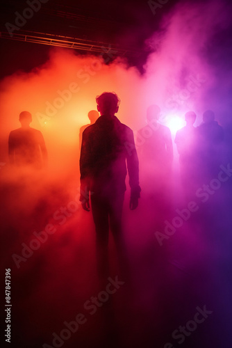 people of ai // group of men standing in the fog, red and purple lights, swirling mist, silhouette, party atmosphere, nightlife, club, photorealistic // ai-generated