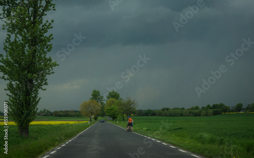 People ride bikes in sturmy weather somewhere in Poland in May 2017