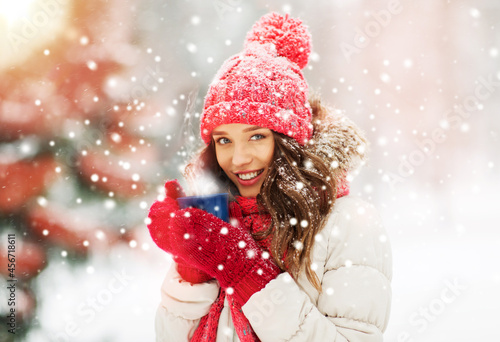 people, season and christmas concept - happy teenage girl or young woman with tea cup outdoors in winter park