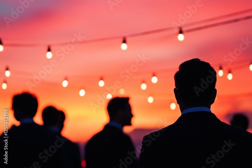 silhouette, people, sunset, sky, man, group, backview, dark, orange, red, gathering, event, illuminated, party, outdoors, evening, light, shadow, suit, clothing, shirt, standing, stylish, trendy, anonymous