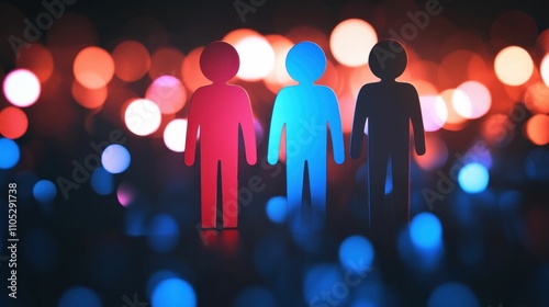 people, silhouettes, colorful, abstract, bokeh effect, diversity, unity, teamwork, togetherness, friendship Three stylized human figures in red, blue, and black against a blurred colorful background