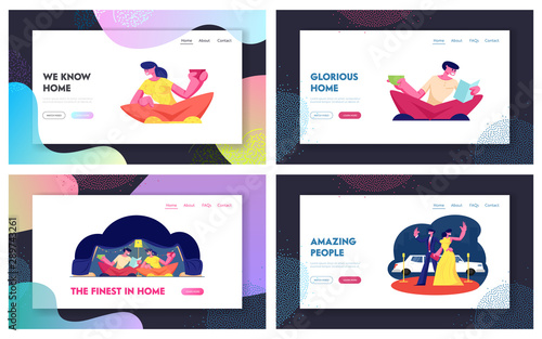 People Spend Time at Home Reading Books, Drinking Beverages, Red Carpet Ceremony Website Landing Page Set. Happy Male and Female Characters Leisure Web Page Banner. Cartoon Flat Vector Illustration