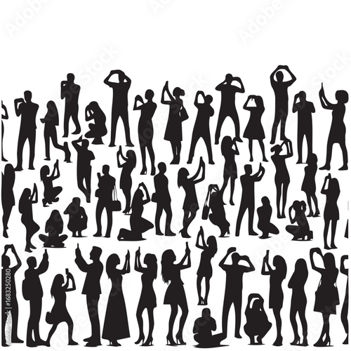 People Taking Photos Silhouette Set – Vector Illustration Group with Smartphones – Black and White Silhouettes Crowd Taking Pictures – Vector People Silhouette Design