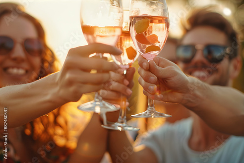 People toasting rose wine outside at a winery. Lifestyle concept with friend enjoying good time