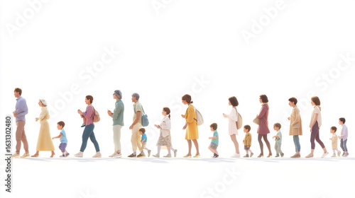 People walking together a diverse group of adults and children stroll in a line against a white background