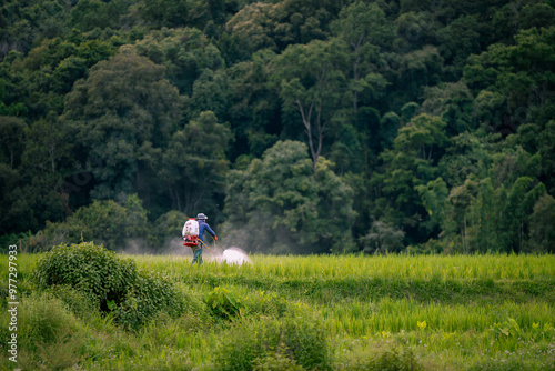 people work at farm produce green rice field as agriculture job in rural life chiangmai thailand