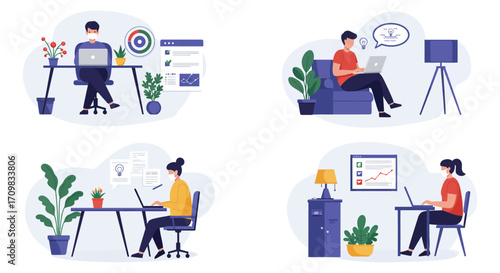 home office, laptop, computer, desk, sofa, chair, plant, indoor, workspace, freelance, productivity, technology, modern, illustration, vector, design, lifestyle, business, employee, connectivity, communication, isolation