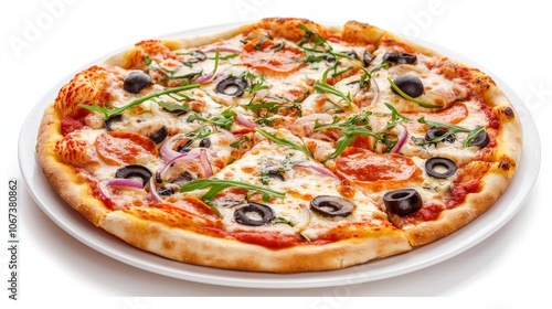 pizza, pepperoni, olive, black olive, red onion, arugula, mozzarella, crust, italian food, italian cuisine, fast food, dinner, lunch, meal, snack, appetising, delicious, tasty, fresh, homemade, eatery, food photography, white background, isolated, closeup, half face, epicure, gastronomy, culinary, healthy
