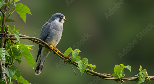 Peregrine falcon resting on a tropical vine with lush green foliage backdrop
