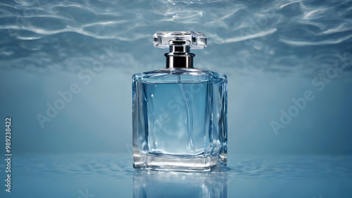Perfume bottle partially submerged in crystal-clear water, with soft blue reflections around it