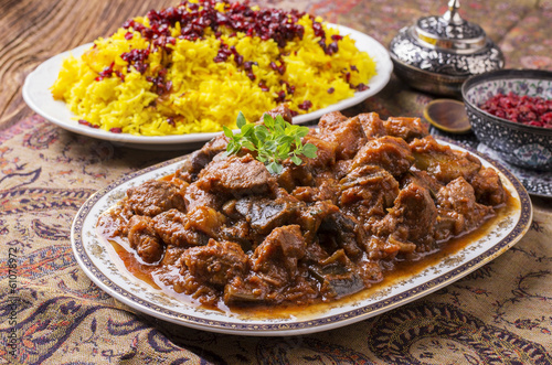 lamb, aubergine, aubergine, stew, persian, ragout, rice, berberis, iranian, meat, food, dish, cook, braised, spicey, vegetable, saffron, tomatoes, orient, traditional, speciality, casserole, served, bowl, beef, receipe, closeup, plate, pattern, table, wooden