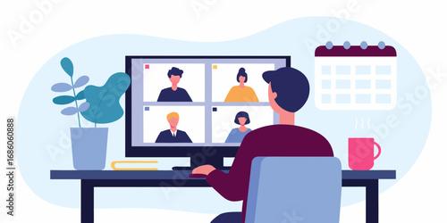 collaboration, communication, business, technology, cyberspace, computer, screen, people, colleague, team, discussion, education, distance learning, office, desk, chair, mug, hot drink, plant, calendar, schedule, planning, organisation, illustration, modern, vector, digital, connection, networking, pandemic, business meeting, teamwork