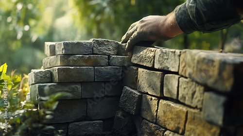 stone wall, construction, hand, glove, brick, building, masonry, work, nature, greenery, sunlight