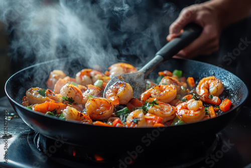 Person cooking shrimp in a skillet with vegetables sizzling.
