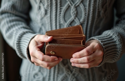Person hands hold brown leather wallet, close-up. Unrecognizable individual shows open billfold. Financial theme, payment, shopping, savings, or business.