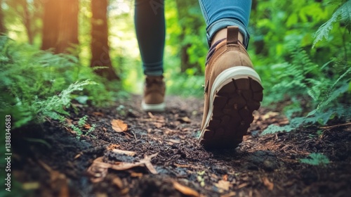 person, hiking, walking, outdoors, boot, leather, trail, forest, foliage, path, step, adventure, nature, travel, activity, footwear, closeup, sunlight, ground, dirtied, plant, green, movement, daytime, timberland, fern, jean, explore, lifestyle, leisure, recreation, healthy, environment, tour tourism, dirt, trekking, journey, discovery