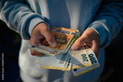 Person holding euro banknotes in hands, counting money outdoors. Close-up view of 50, 100, and 200 euro bills