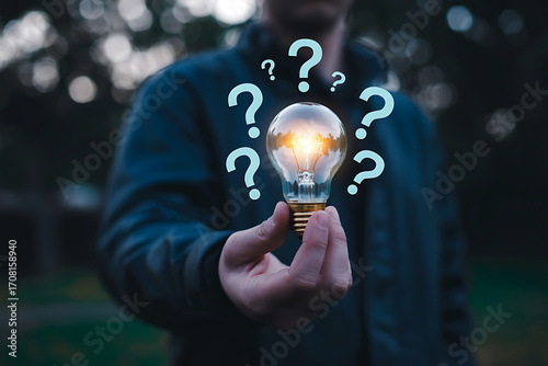 Person holding glowing light bulb surrounded by question marks representing ideas and solutions