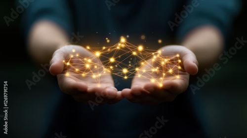 hand, network, connection, glowing, light, energy, dark, technology, future, abstract, datum, digital, science, communication, innovation, cyberspace, global, ai, artificial, intelligence, palm, holding, cupped, synergy, collaboration, leadership, teamwork, connectivity, node, structure, design, particle, dot, line, illuminated, aethereal, futuristic, creativity, imagination, brilliance, potential, power, progress, vision, human, development, growth, solution