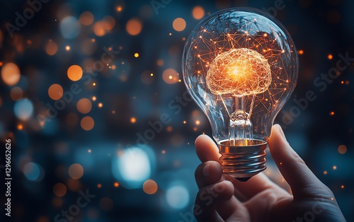 Person holding glowing virtual lightbulb with brain inside, symbolizing smart thinking and creativity, bokeh background, entrepreneur showcasing innovative idea