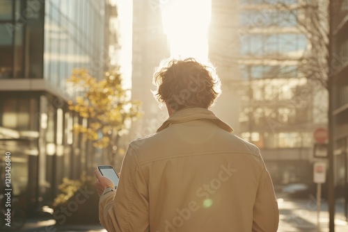 person, smartphone, urban, street, sunlight, city, walking, backview, modern architecture, casual clothes, lifestyle, technology, outdoors, concrete, tree, morning, warm light, exploration, communication, travel, scene, atmosphere, perspective, relaxation, connectivity, solitude, environment, daytime, building, architecture, business, casual attire, wandering, journey, activity, bright, leisure, sunshine, individual, fresh air, sunlit, city landscape, joy, sharpened, engagement, city life, portrait